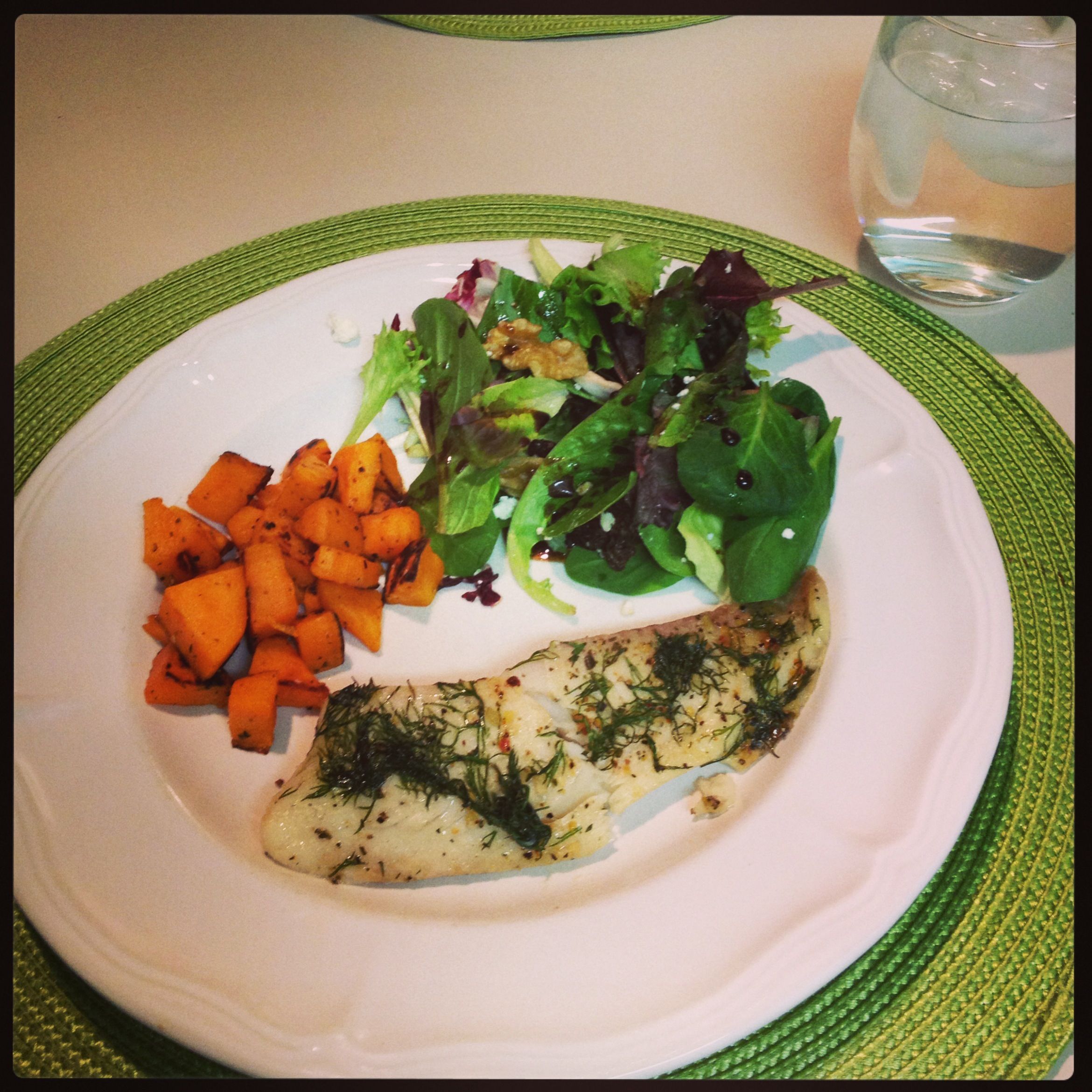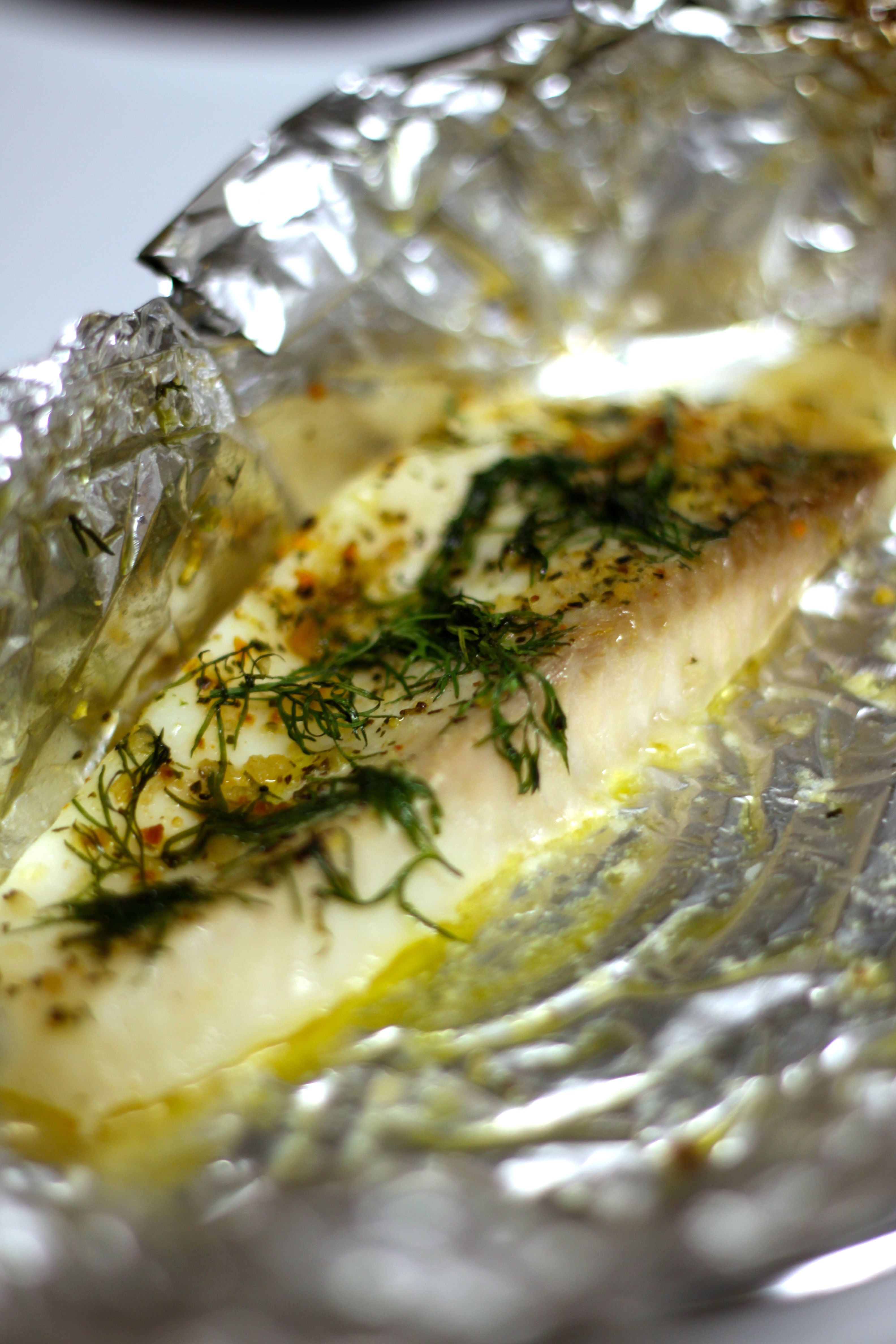 Heat your oven to 350 degrees. Grab enough foil to make a fish pocket. Now I wish I could tell you the secret to an awesome fish pocket. Mine always look wonky, but work out just lovely anyway. I like to make the pocket, spray it with a little olive oil spray and throw the tilapia in there. Squeeze some fresh lemon juice on top, drizzle some olive oil, sprinkle your favorite seasoning on top and last add the dill. Close up your fish pocket and throw it in the oven for about 15-20 minutes. You’ll know it’s done when it’s opaque (you can’t see through it anymore). I served mine with homemade tzatziki, some sautéed sweet potatoes and salad.