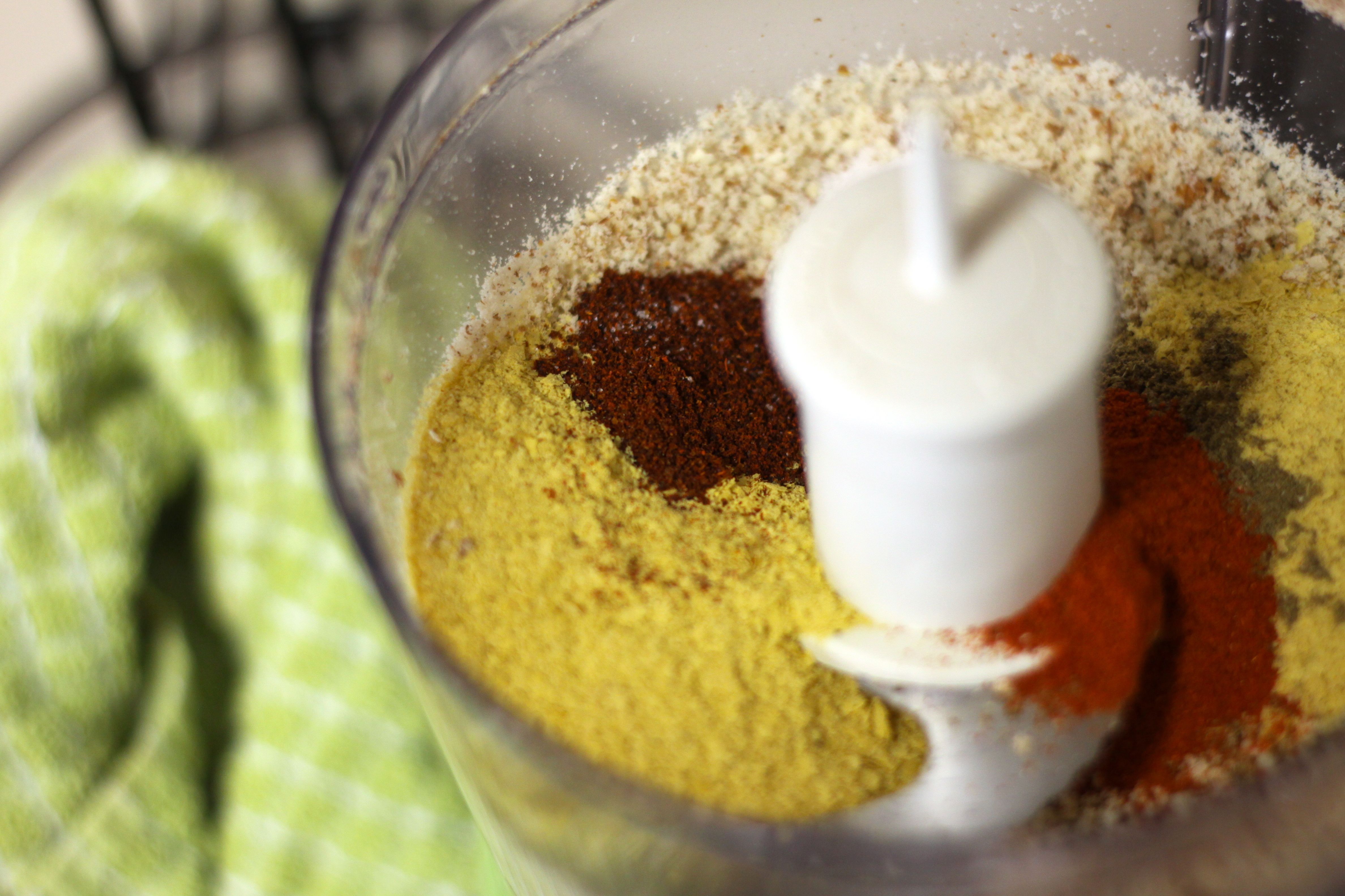 - Place all dry ingredients (almonds, spices and nutritional yeast) in a food processor. Pulse until the almonds are well chopped and blend/puree until you have a “meal” consistency.