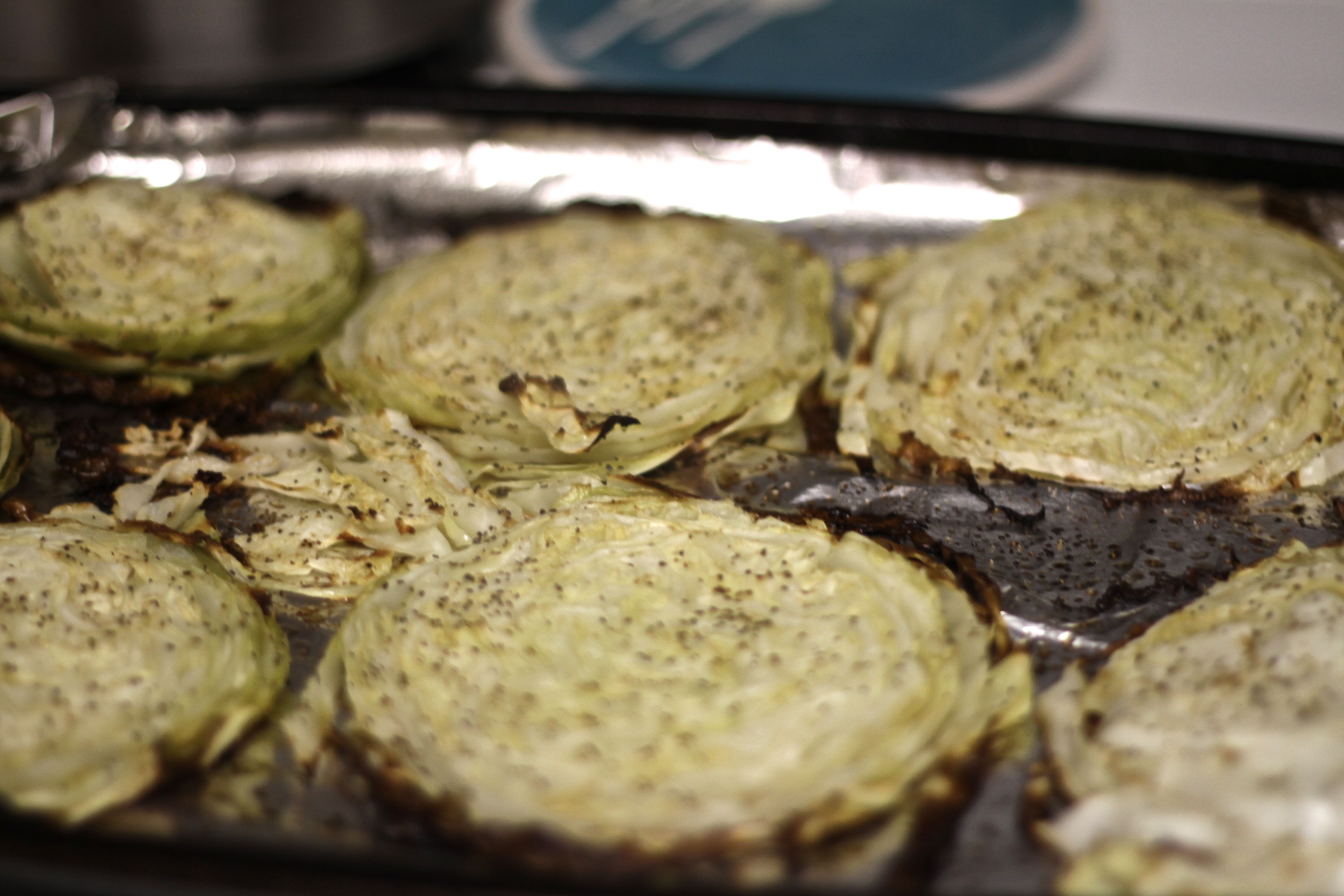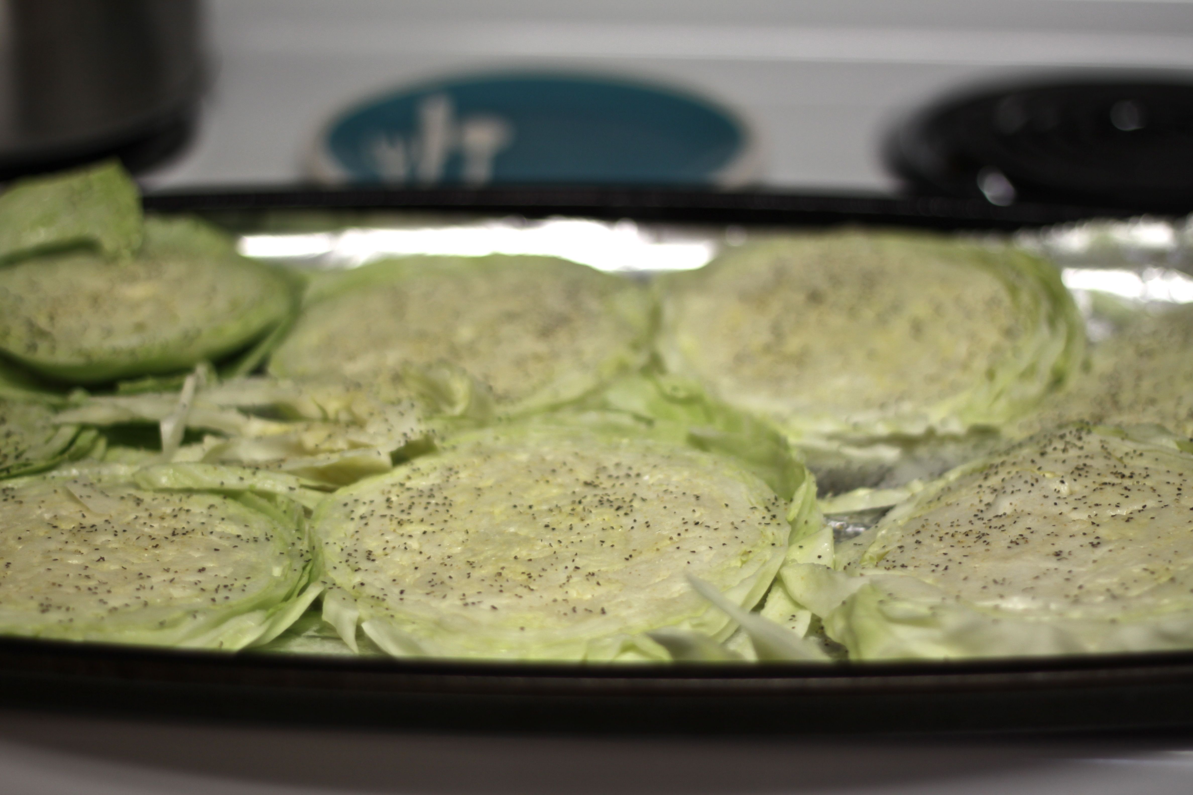 IMG_9208Your magic surprise ingredient is cabbage! Simply preheat your oven to 400 degrees, slice the cabbage and drizzle coconut oil all over it – seasoning it however you’d like (I use salt, pepper and garlic powder).