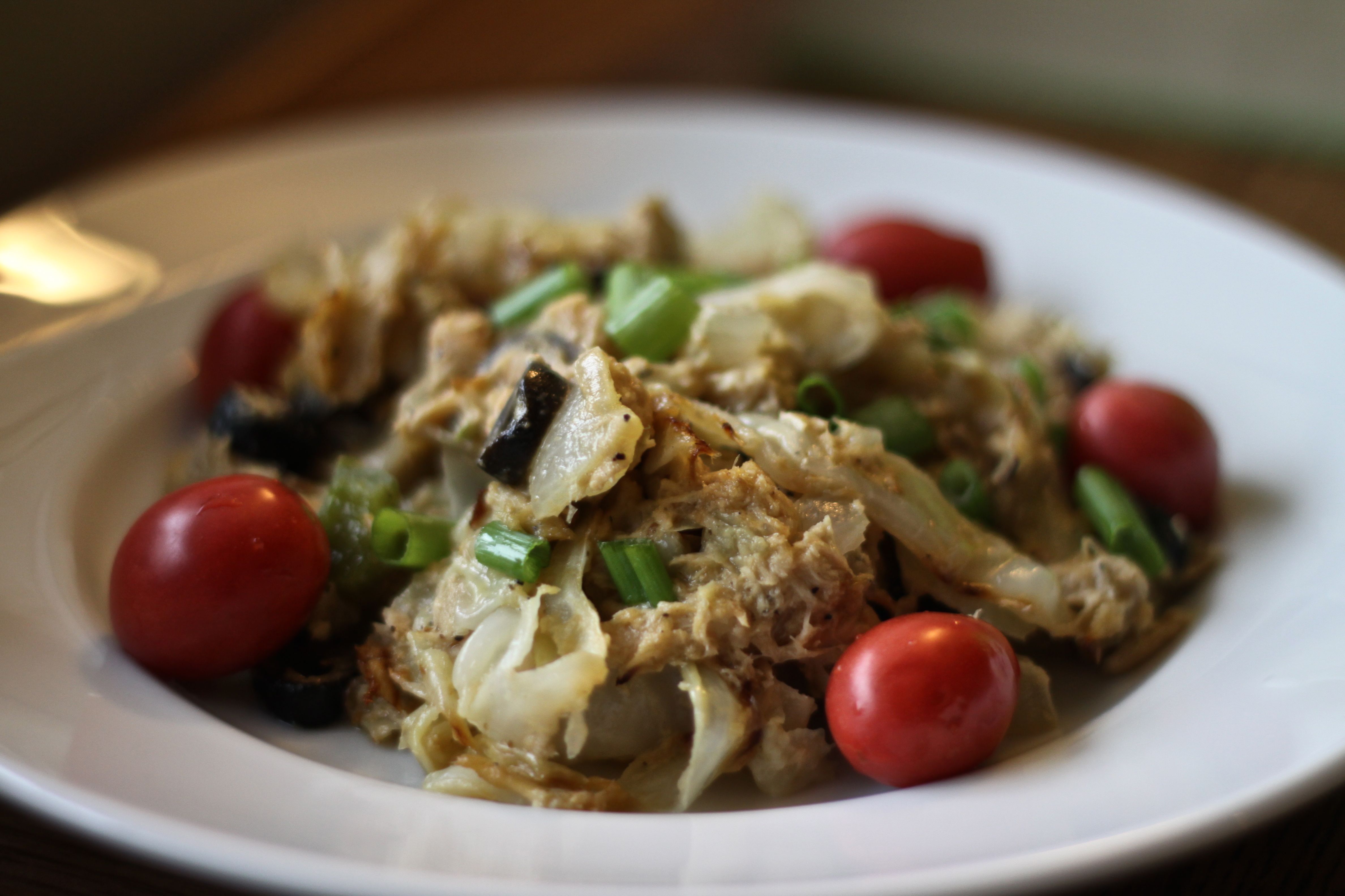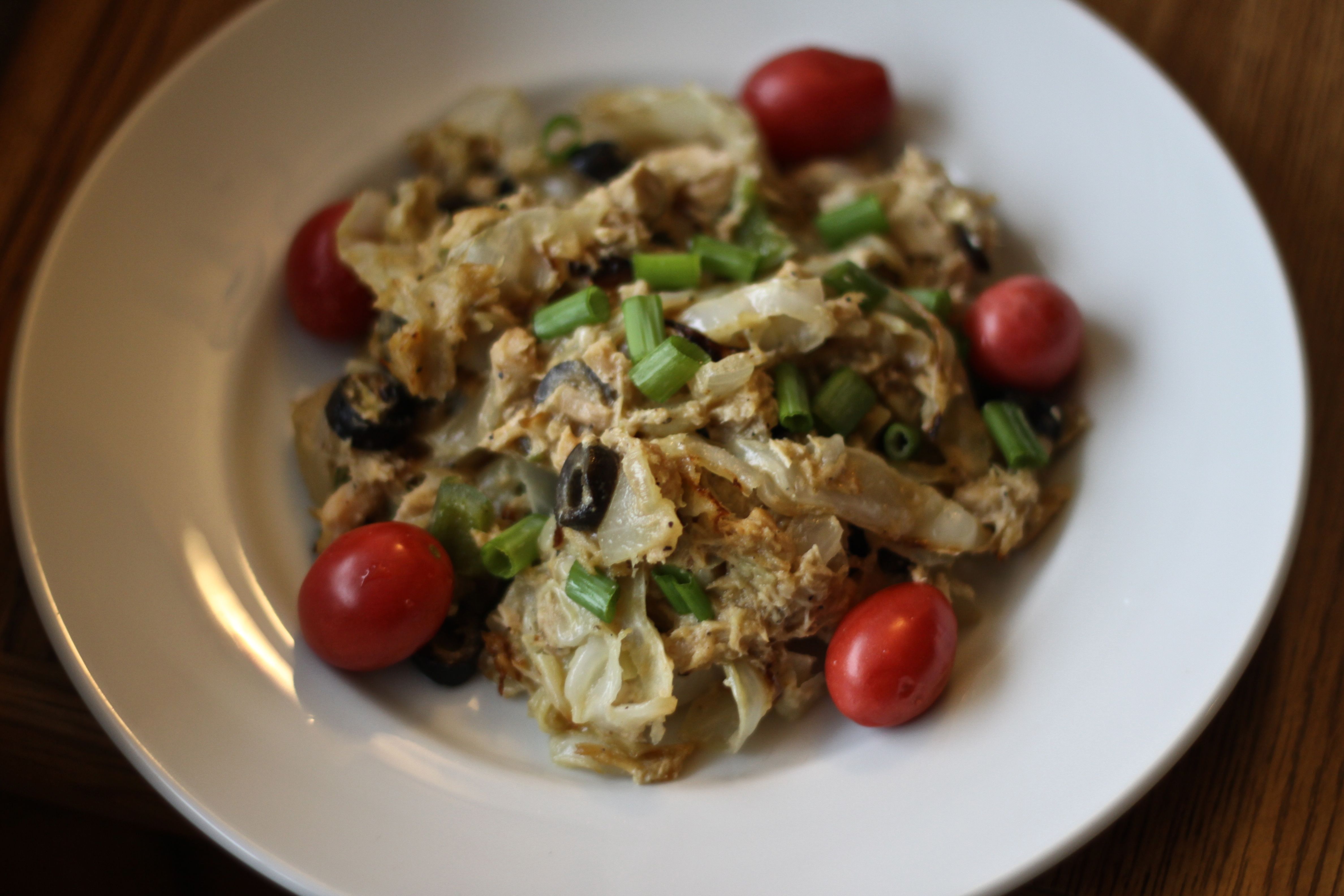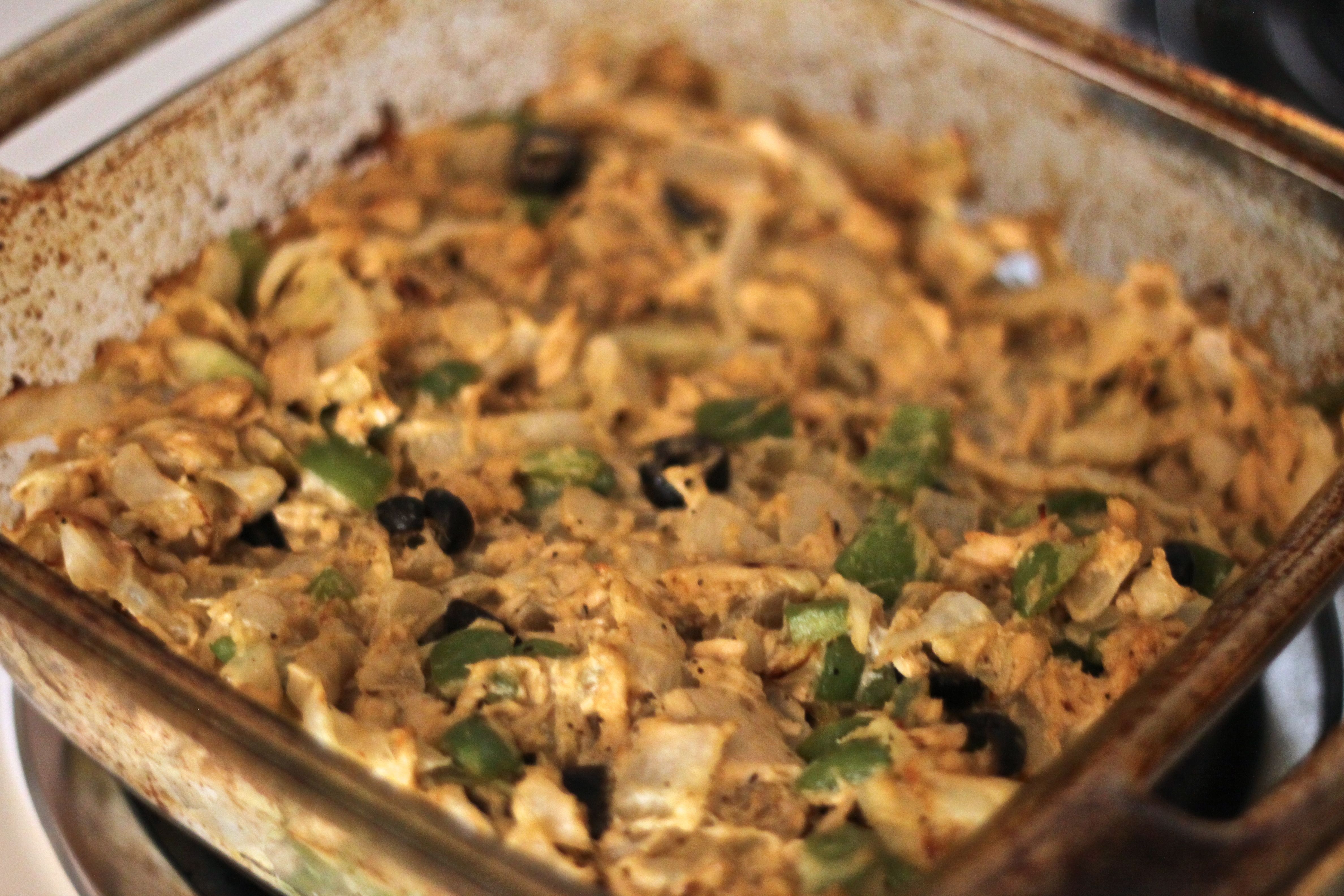 When your cabbage noodles are ready, combine all your ingredients in a large bowl and stir well. I add the olives last so they stay intact. Pour everything into your prepared baking dish and bake at 350 for 20 minutes or until it starts to brown on top.