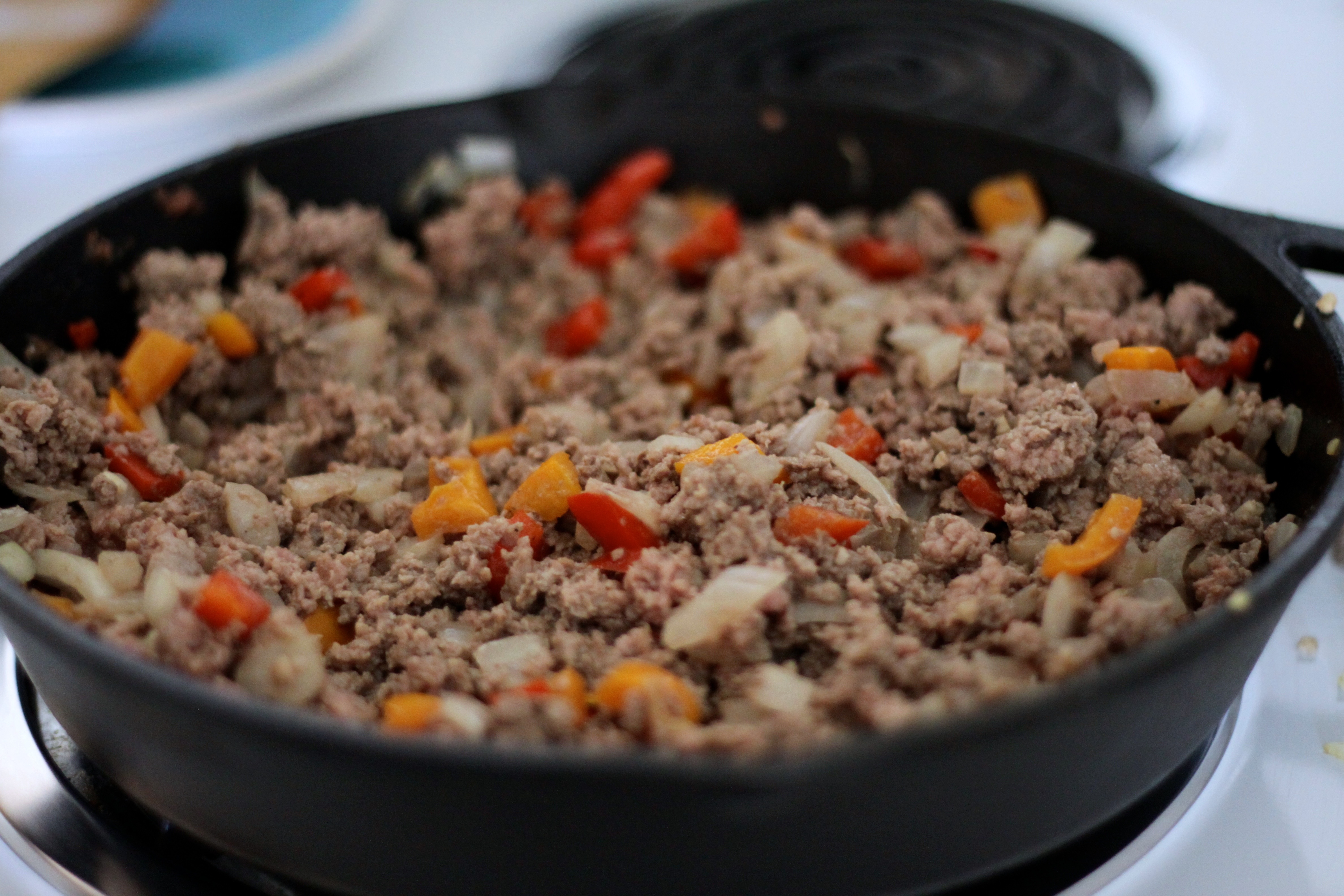 1. In a cast iron skillet heat your cooking fat. Sauté onions and peppers and garlic until cooked through. Add the ground beef, cumin, sea salt and black pepper and cook through (you can set the veggies aside in a bowl if the beef isn’t cooking, I know…one more dish).