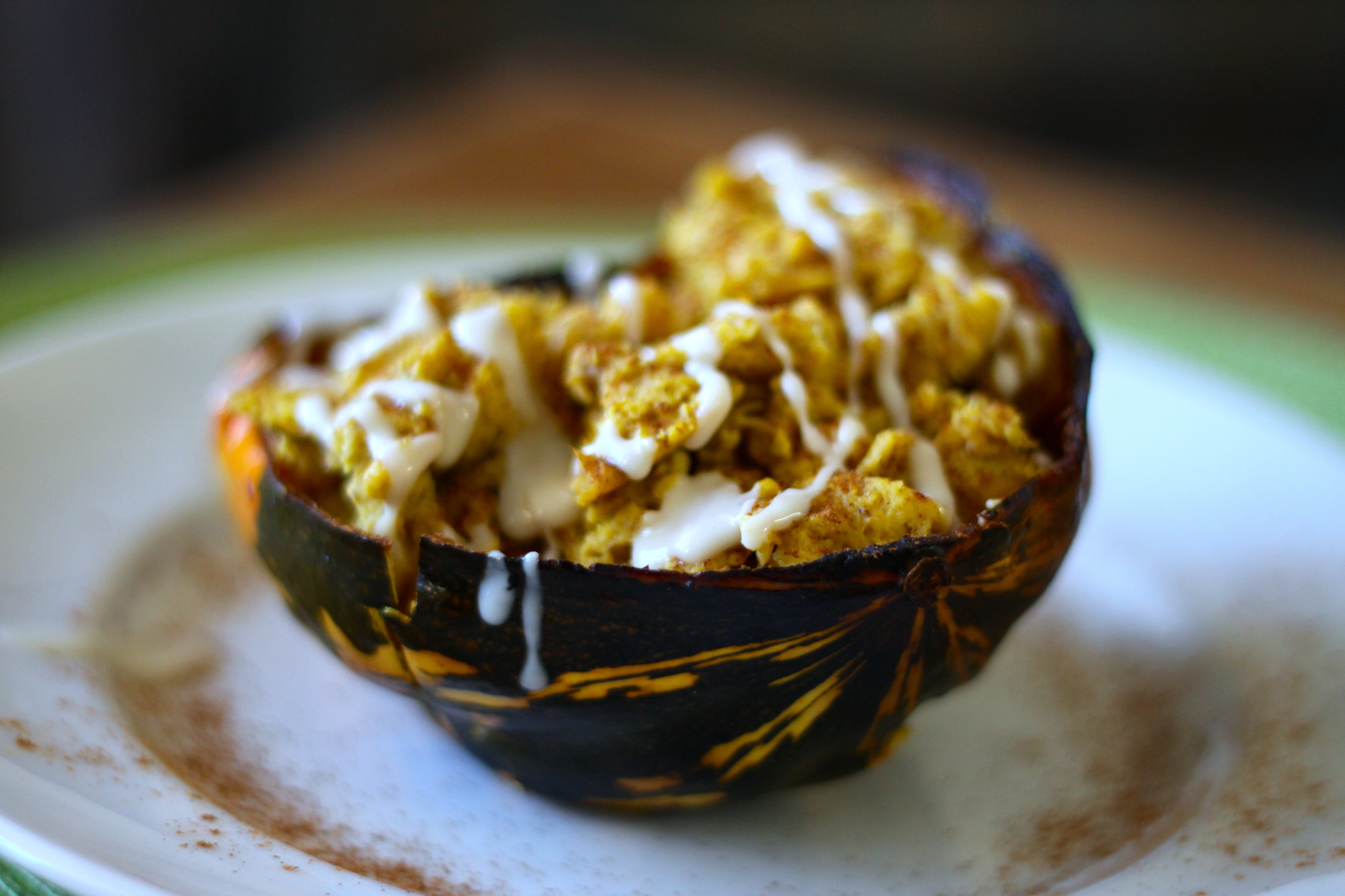 IMG_9254These pictures are actually a carnival squash. It’s a little bit sweeter than acorn squash and you can eat the skin! You can use either — well actually you can use any winter squash! This recipe is for 1, but you can easily double the recipe or even triple or quadruple it! This would make a great brunch dish!